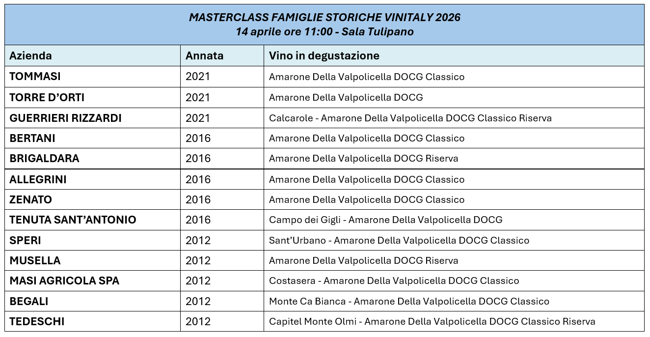 «L’Amarone non è un vino fermo nel tempo, ma un linguaggio che evolve. Oggi la sfida non è più spiegare cosa sia, ma come proporlo in modo attuale: nella sua versatilità, nella precisione stilistica e nella sua naturale vocazione alla tavola. Tempo, servizio e scelta diventano leve decisive per renderlo più accessibile e rilevante nella ristorazione. Il confronto tra annate ci consente di raccontare un’identità solida e riconoscibile, che si rinnova nel modo in cui viene interpretata e proposta. Le Famiglie Storiche rappresentano questa visione condivisa: custodire l’identità dell’Amarone e, allo stesso tempo, guidarne l’evoluzione» afferma Pierangelo Tommasi, presidente dell’Associazione Famiglie Storiche.