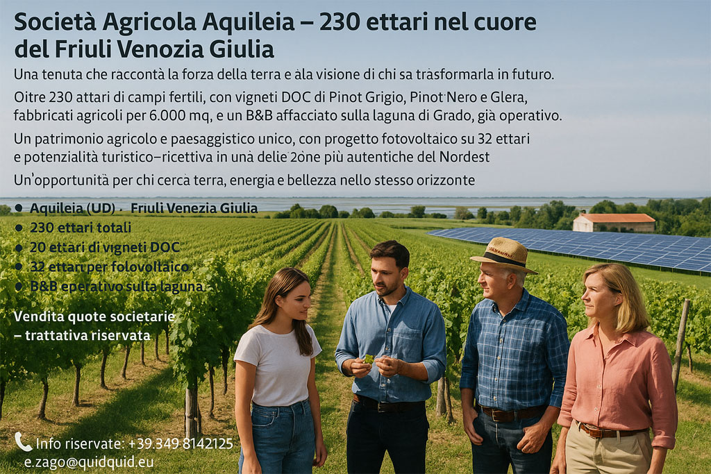 Nel cuore della pianura friulana, a pochi chilometri dal mare e dalla laguna di Grado, si propone in vendita la totalità delle quote della Società Agricola Aquileia, titolare di una prestigiosa proprietà agricola di oltre 230 ettari, condotta a seminativi, vigneti e aree con potenzialità energetiche e turistico–ricettive.
