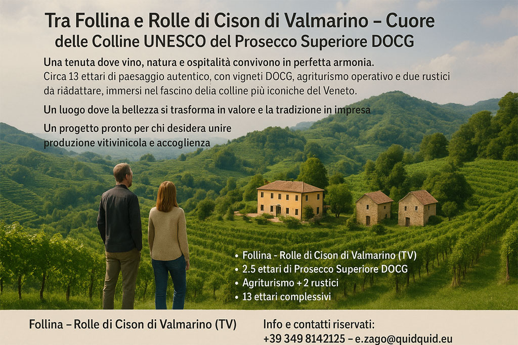Nel cuore delle Colline del Prosecco Superiore, patrimonio mondiale UNESCO, tra Follina e Rolle di Cison di Valmarino, si propone in vendita una splendida proprietà agricola di circa 13 ettari complessivi, con vigneti Prosecco DOCG, agriturismo operativo e due rustici da riadattare, immersi in uno dei paesaggi più autentici e suggestivi del Veneto.