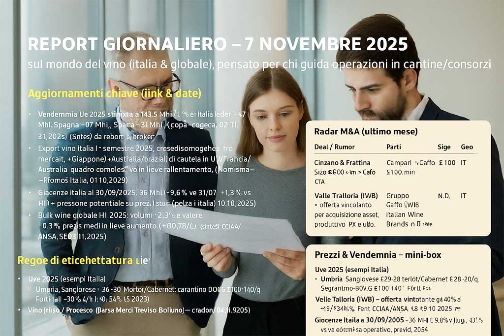 Report giornaliero – 7 novembre 2025 sul mondo del vino (Italia & globale), pensato per chi guida operazioni in cantine/consorzi.