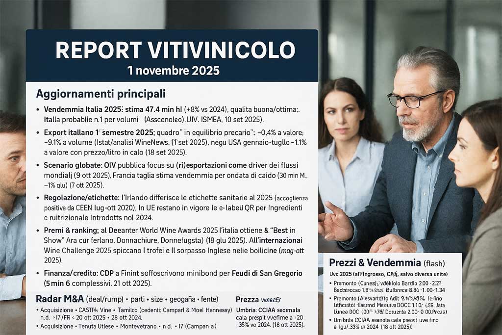 – Scenario globale: OIV pubblica focus su ri‑esportazioni come driver dei flussi mondiali (9 ott 2025). Francia taglia stima vendemmia per ondata di caldo (36 mln hl, ‑1% a/a) (7 ott 2025).