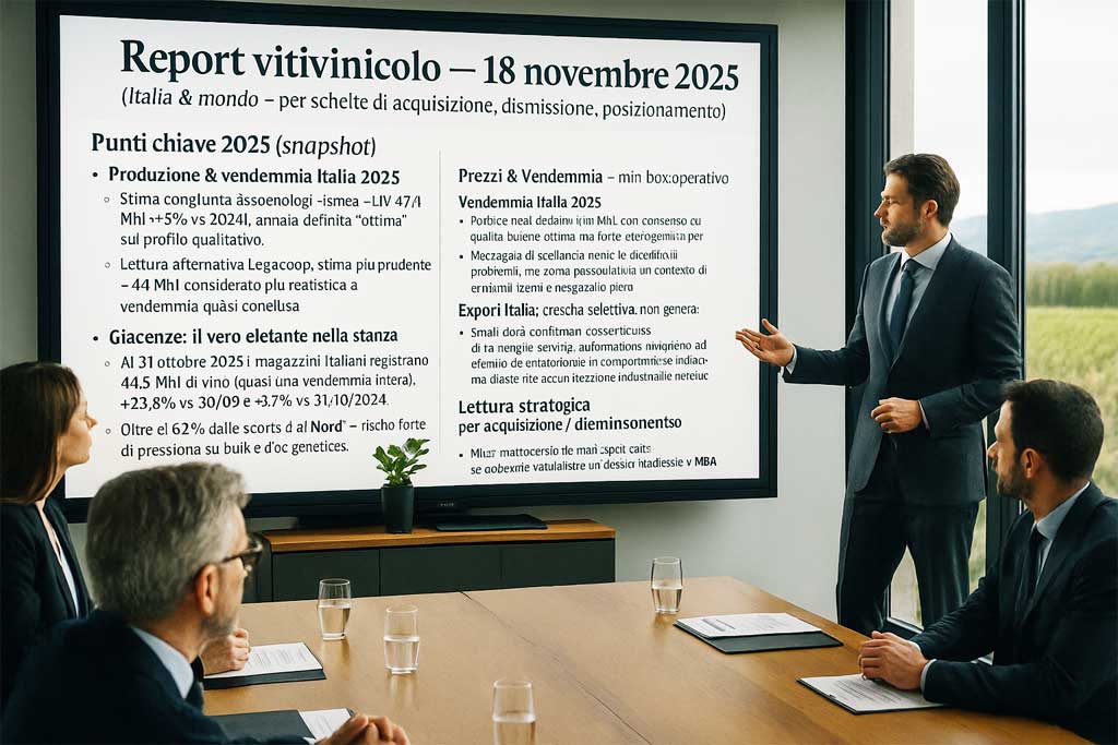 - Al 31 ottobre 2025 i magazzini italiani registrano 44,5 Mhl di vino (quasi una vendemmia intera), +23,8% vs 30/09 e +5,2% vs 31/10/2024.