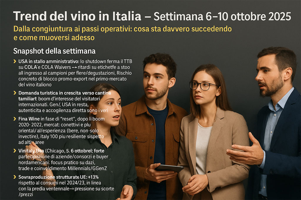 - USA in stallo amministrativo: lo shutdown ferma il TTB su COLA e COLA Waivers → ritardi su etichette e stop all’ingresso di campioni per fiere/degustazioni. Rischio concreto di blocco promo-export nel primo mercato del vino italiano.