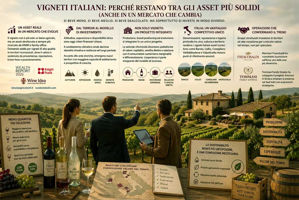 Le evidenze emerse dal Wealth Report 2026 di Knight Frank e l’attività del network Wine Idea (attraverso piattaforme come tenuteagricole24.it e ruralestate24.com) confermano una dinamica ormai chiara agli operatori: il vigneto non è più solo un bene agricolo, ma un asset strutturato e sempre più ricercato da HNWI e family office.